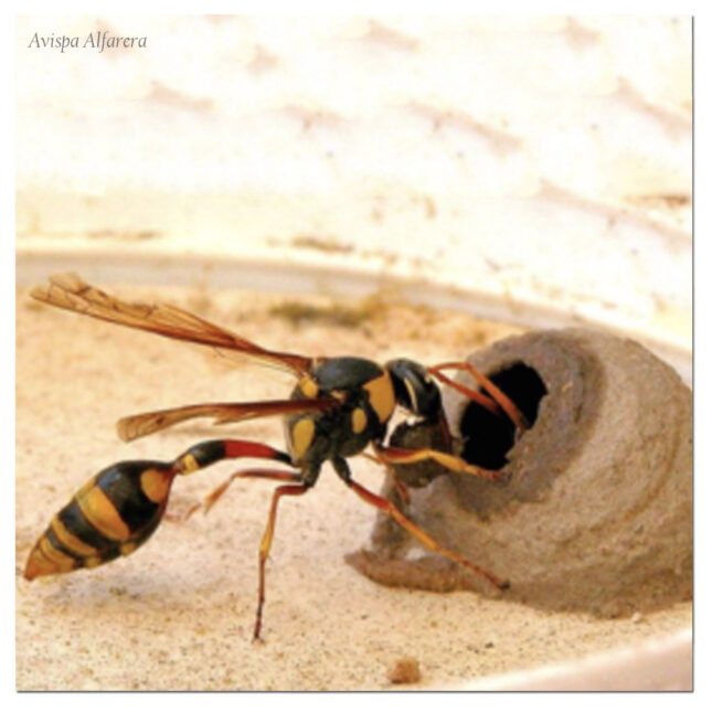 Esta especie es muy curiosa, ya que no la podemos asociar a grandes colmenas de aspecto redondeado como sus otras parientes. La avispa alfarera crea nidos de barro, muy parecidos a los botijos. En su interior almacenan alimento e introducen sus larvas. La apariencia de esta avispa es diferente, ya que tiene el cuerpo alargado y muy fino. Habitualmente nos podemos encontrar nidos de avispa alfarera en perfiles de ventanas.