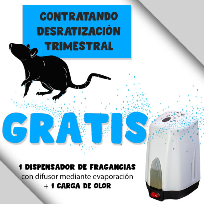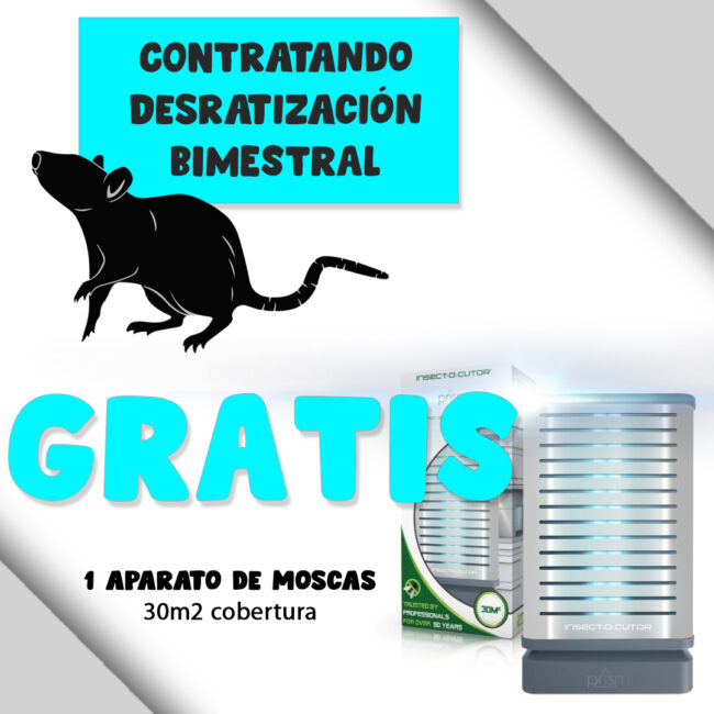 Contratación de mantenimiento bimestral + REGALO Por la contratación de mantenimiento de desratización (ratas-ratones) con revisiones bimestrales, REGALO de un aparato de moscas Prism valorado en 77,20 € Válido para contrato anual de desratización con revisiones trimestrales Oferta válida para nuevas contrataciones Empresas, industria, comercio, organismos oficiales (otros a consultar) Oferta válida hasta fin…